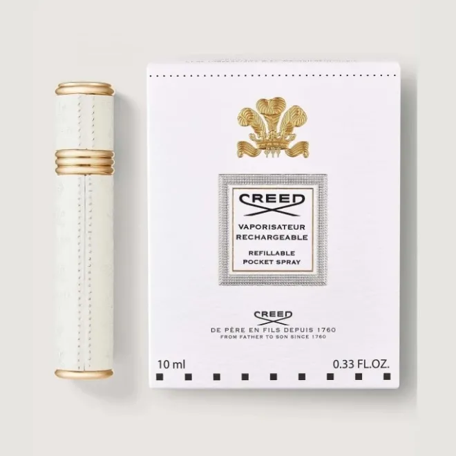 Séduisant par son élégance traditionnelle, ce vaporisateur cylindrique Creed de 10 ml magnifié de finitions dorées est protégé par un étui au cuir blanc estampillé.