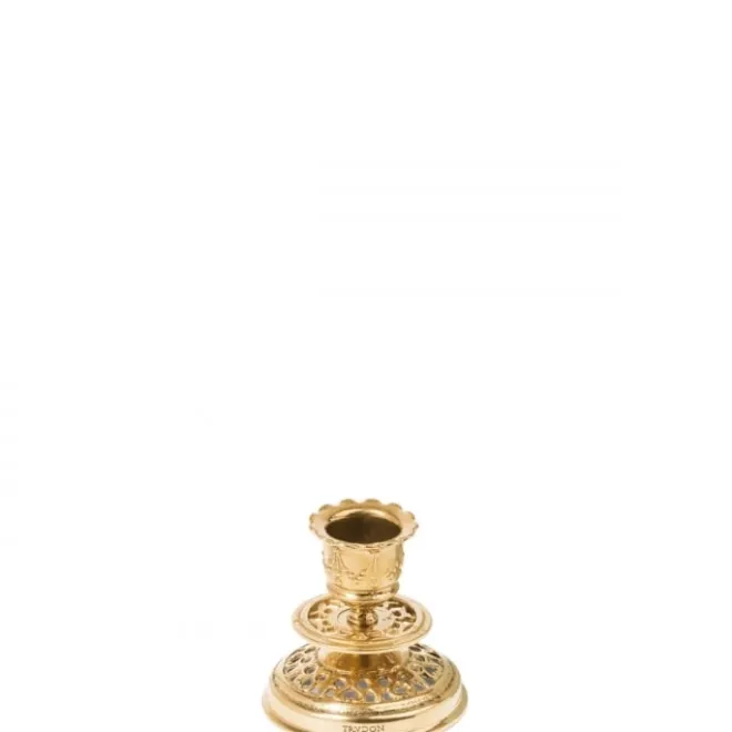 Compagnons idéaux d’une mise en scène, bougeoirs, candélabres et chandeliers jouent un jeu théâtral et étirent leur silhouette. Ce bougeoir fleur en métal doré convient aux bougies de la Madeleine.