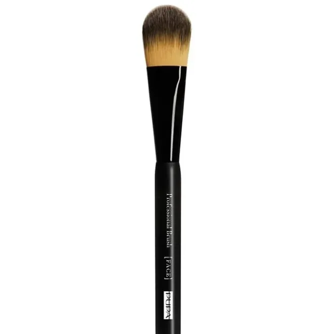 - En utilisant le pinceau coté plat, appliquez le fond de teint sur l’ensemble du visage en l’ étirant du centre du visage vers l’extérieur et en estompant sur les contours.