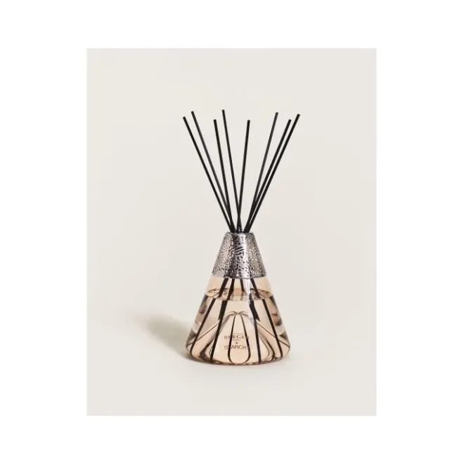 Le Bouquet parfumé Starck Peau de Soie est empreint de féminité et de modernité. Les lignes pures et intemporelles, en filigrane de la collection, sont le résultat d’une vision commune, celle du designer Philippe Starck et de Maison Berger Paris. L’œil est tout de suite interpellé par la forme conique singulière de l’objet rappelant la verrerie de laboratoire. Toute son originalité réside dans le façonnage de sa semelle. Celle-ci a été bombée, donnant comme une impression de « verre dans le verre » et une sensation de légèreté. Tandis que sa bague métallique aux motifs organiques signe l’ensemble. Le Bouquet parfumé Starck Peau de Soie s’inscrit dans une tendance minimaliste. Revêtu d’une couleur rose translucide pleine de délicatesse, incarnant à merveille le parfum Peau de Soie 400 ml qui l’accompagne, partez pour un ballet olfactif fascinant. Profitez des notes poudrées de violette subtilement contrastées par le musc blanc et les senteurs chyprées du patchouli, dans une belle dualité féminin/masculin.