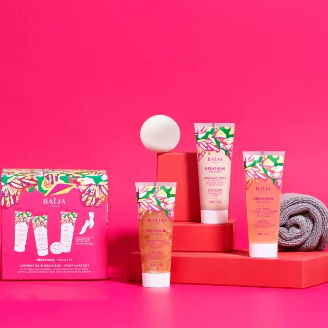 BAÏJA vous présente son Coffret soins pieds Défatigant, comprenant 4 soins exquis pour le corps & 1 accessoire exclusif :