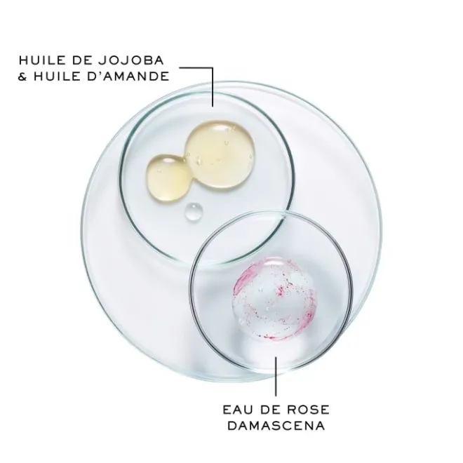 – A une phase aqueuse constituée d’eau de rose damascena qui élimine sans effort le maquillage le plus tenace sans laisser de résidus et d’impuretés.