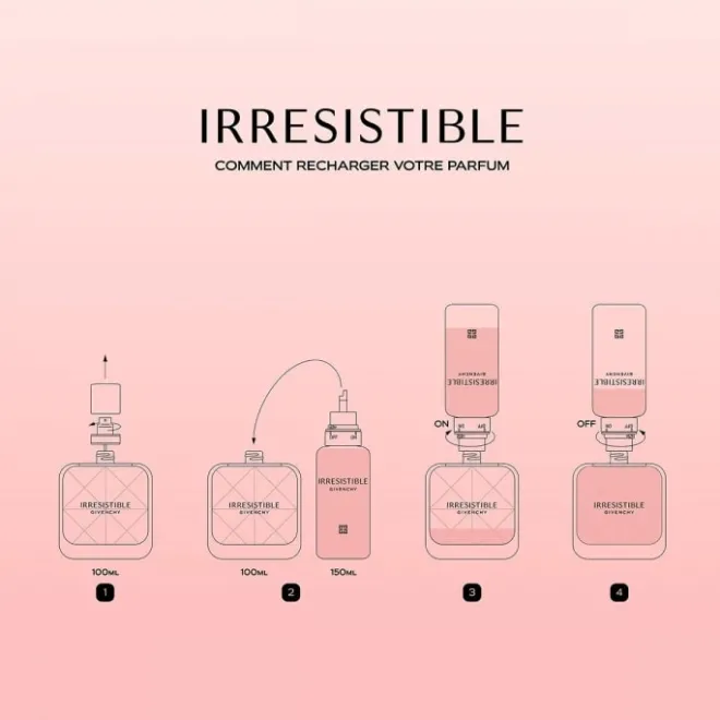 - Rechargez facilement votre flacon Irresistible Eau de Parfum 100 ml portant la mention « Rechargeable » avec la Recharge Irresistible Eau de Parfum 150ml.
