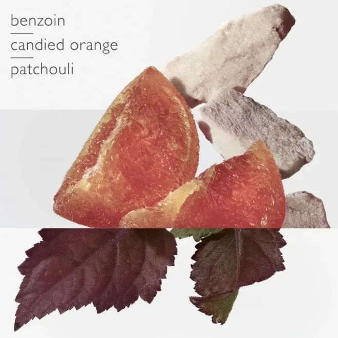 Une Eau de Parfum boisée et ambrée, qui mêle une orange confite gourmande, un benjoin enveloppant et un patchouli profond.