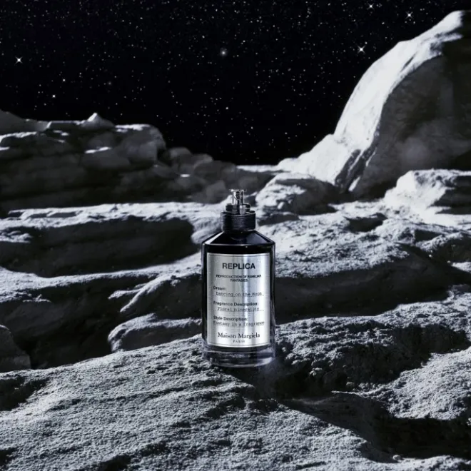 Le flacon « Replica » s’assombrit faisant lui aussi allusion à l’univers nocturne. L’étiquette ‘Replica’ est métallisée, perpétuant le code signature des collections ‘Artisanales’ et Prêt-à-Porter Maison Margiela.