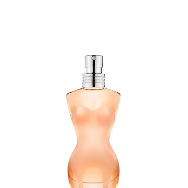 L’eau de toilette Classique Jean Paul Gaultier est proposée dans un flacon en forme de buste aux lignes ultra sensuelles. Revêtue d’un corset emblématique de la maison Jean Paul Gaultier, la silhouette affiche une taille, des hanches et une poitrine marquée pour révéler sa féminité. Le jus en lui-même révèle une couleur pêche qui évoque toute la sensualité et la tendresse de la peau d’une femme.