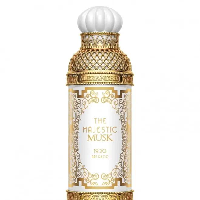 Spécialement créé à l’occasion du lancement de la collection Art Déco, le flacon de l’eau de parfum The Majestic Musk Alexandre J est un clin d’œil au luxe ostentatoire des années 20. Partiellement recouvert d’un maillage ajouré, cet écrin affiche des motifs géométriques qui tranchent avec le style oriental de son bouchon-dôme et de ses arabesques. Ce flacon, qui sert d’écrin à tous les parfums The Art Deco Collector Alexandre J, revêt cette fois une teinte dorée qui accentue son aspect luxueux et raffiné.