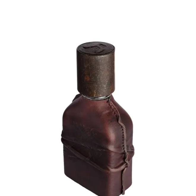 Cuoium flotte dans une flasque de verre munie d’un bouchon en métal rouillé, incrusté d’un logo original en cuir tanné végétal.