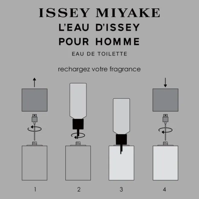 - Étape 2 : Vissez la recharge sur votre flacon de L’Eau d’Issey pour Homme Eau de Toilette pour commencer à le remplir.