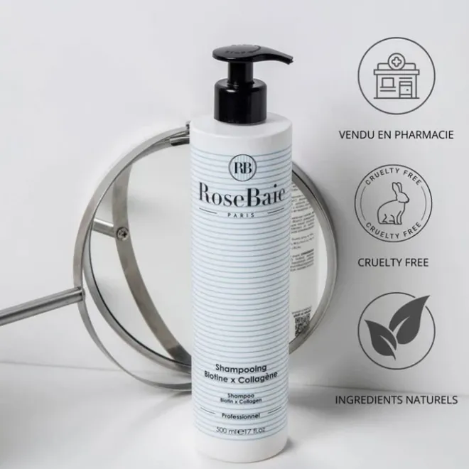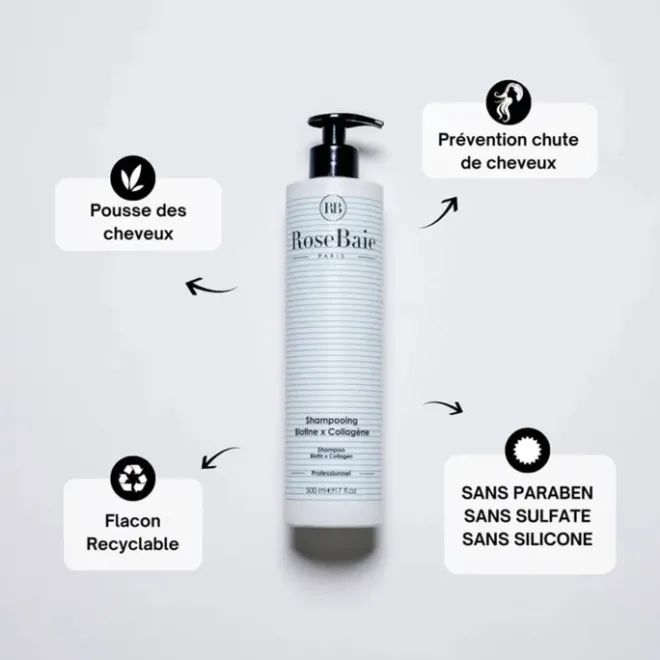 Boostez la santé de vos cheveux avec le Shampoing Biotine & Collagène Rosebaie, formulé pour stimuler la croissance et fortifier la fibre capillaire.