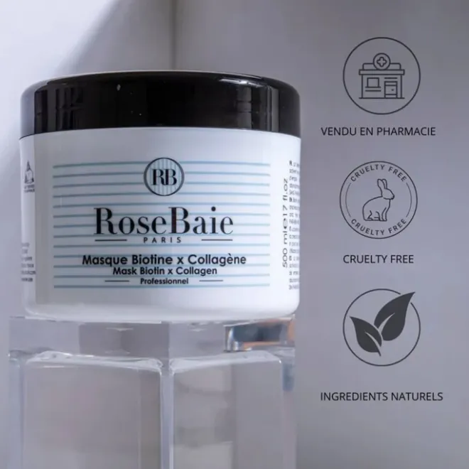 Réparez intensément vos cheveux avec le Masque Biotine & Collagène Rosebaie, un soin profond conçu pour revitaliser et hydrater les cheveux fragilisés.