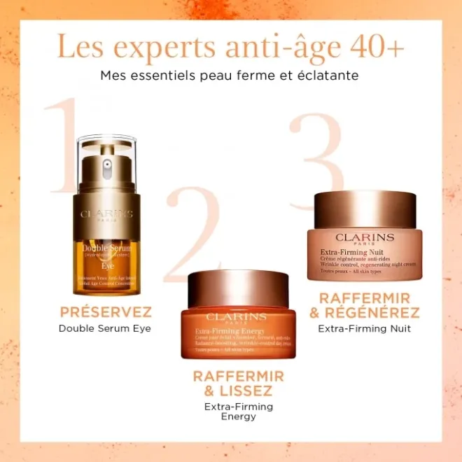 Destinée à combattre le relâchement de la peau, la collection Extra-Firming de Clarins est une gamme de soins raffermissants spécialement conçue pour les femmes de 40 ans et plus. Son objectif est simple : vous aider à lutter contre les signes de l’âge et retrouver une peau d’apparence plus jeune, ferme et rebondie. Cette collection propose des essentiels anti-âge pour le visage tels que des crèmes de jour et de nuit aux différentes textures, mais également un sérum, un soin contour des yeux et une crème pour le cou et le décolleté.