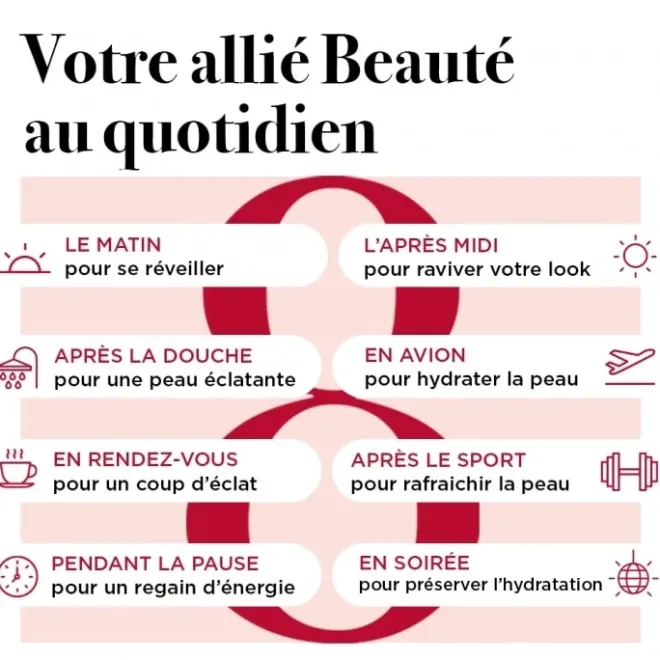 - Appliquer sur le visage après votre nettoyant et votre tonifiant, avant le maquillage pour préparer la peau, et tout au long de la journée pour redonner un coup d’éclat à la peau.