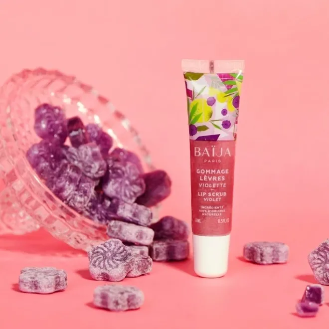 Gommage lèvres violette – Sans paraben – sans alcool – parfum gourmand fruité – texture compacte et souple, fins grains de sucre