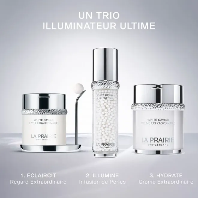 • Avec la collection White Caviar, enrichie de puissants ingrédients actifs dont la Lumidose, La Prairie s’inspire de la sereine clarté des lacs suisses pour élever les soins du visage au rang d’art