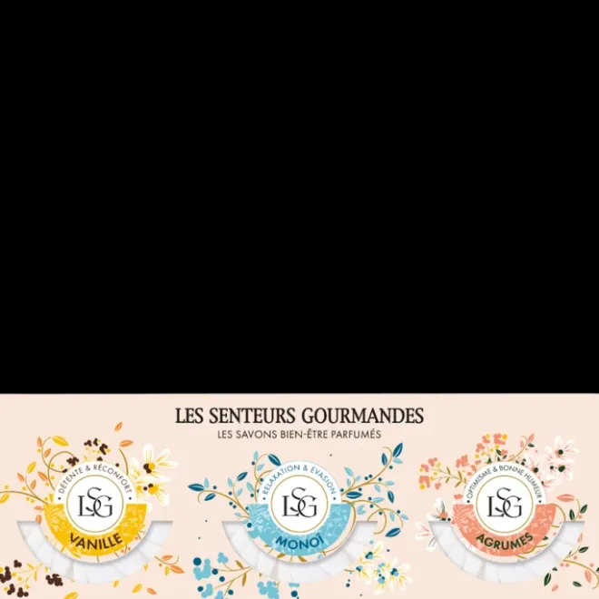Ce coffret contient trois savons bien-être parfumés de 70 g :