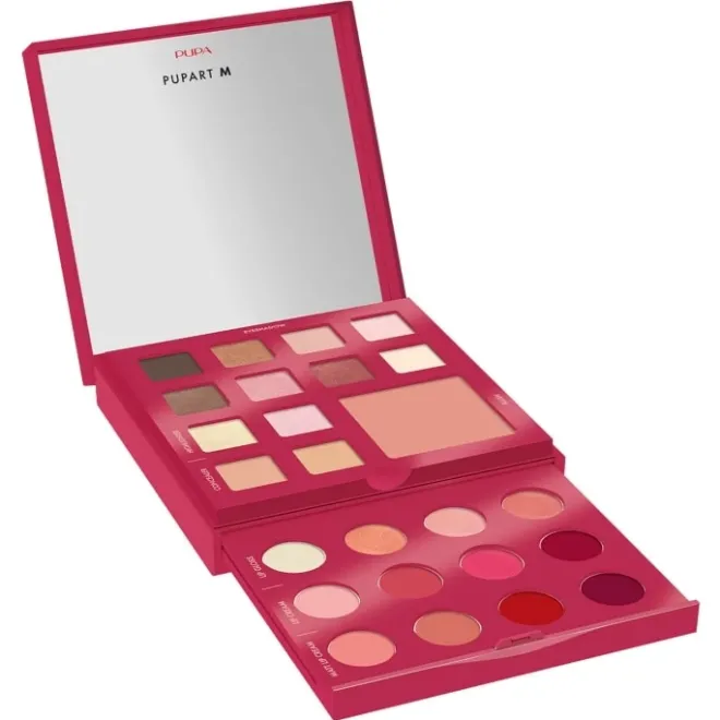 Palette de maquillage consacrée au visage, aux yeux et aux lèvres.