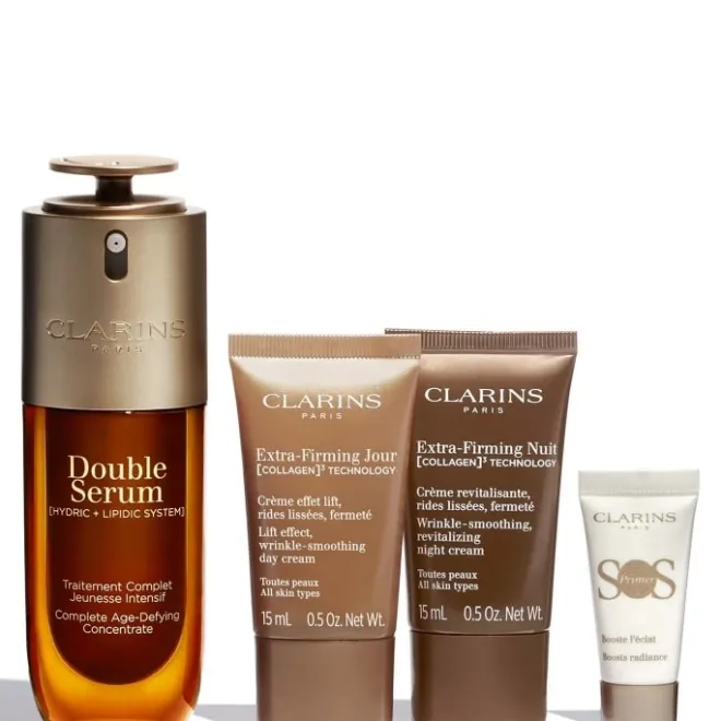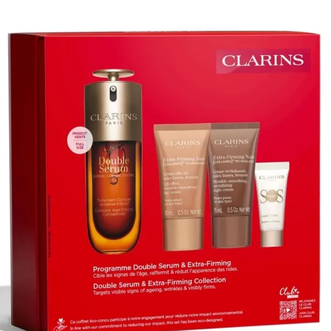 Ce coffret de soins experts est dédié à celles qui veulent une peau d’apparence plus jeune, plus lisse, comme liftée : d’abord l’iconique Double Serum nouvelle génération, traitement complet pour cibler les différents signes de l’âge, vrai rituel jeunesse qui vous donne une peau raffermie, rebondie et plus éclatante. Complétez votre routine effet lift avec le duo Extra-Firming Jour & Nuit et sa [COLLAGEN]3 TECHNOLOGY pour aider à améliorer la fermeté de la peau.