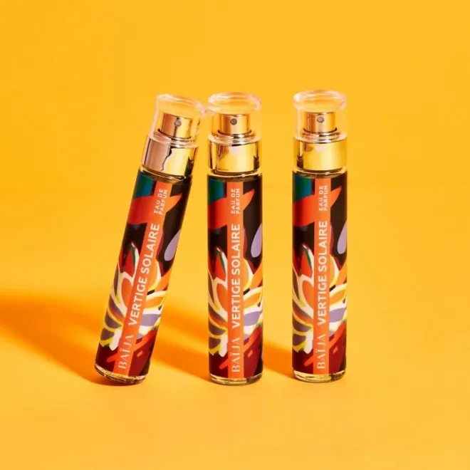- Vaporisez l’Eau de Parfum Vertige Solaire sur les points de pulsation (poignets, derrière les oreilles et sur le cou.