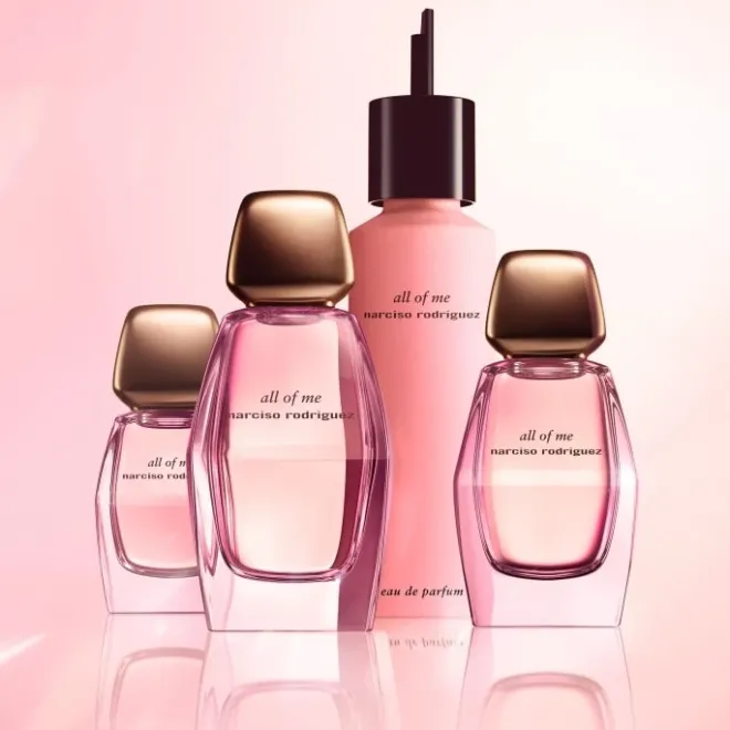 All of me est le nouveau parfum pour femme de Narciso Rodriguez. Un floral aux multiples facettes où la rose iconique se mêle à un géranium audacieux et des muscs blancs délicats.