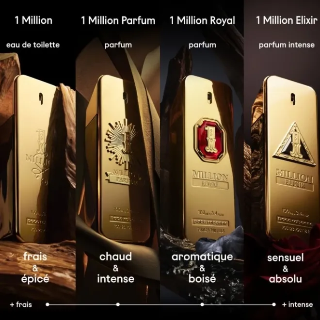 Véritable légende de la parfumerie depuis sa sortie en 2008, l’eau de toilette 1 Million Paco Rabanne a su faire parler d’elle grâce à la sensualité de ses effluves ainsi qu’à l’originalité de son flacon en forme de lingot. Symbole de luxe et d’opulence, cette fragrance est portée par une figure masculine à l’insolence ravageuse, incarnée par un riche playboy à qui nul ne semble résister. En tête des ventes de parfums masculins dans l’hexagone durant 5 années consécutives, elle ne fut que le premier opus d’une longue saga qui continue de s’agrandir. La ligne 1 Million propose aujourd’hui de nombreux produits dérivés tels qu’un déodorant, un gel douche et un baume après-rasage qui reprennent les senteurs du célèbre parfum homme Paco Rabanne.