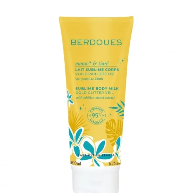 Un Lait Sublime Corps pailleté à l’odeur star de l’Eau de Toilette Monoi & Tiaré, à 96% d’origine naturelle.