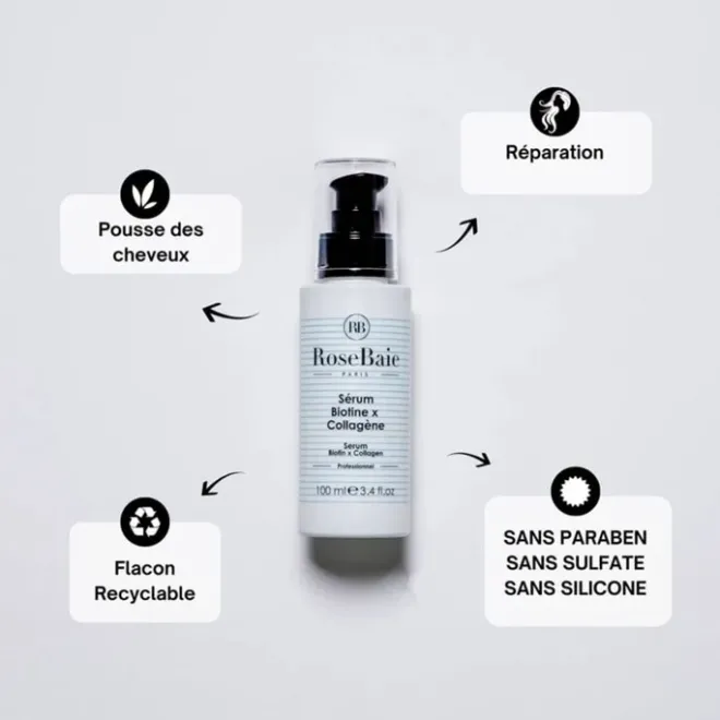 Découvrez le Sérum Biotine & Collagène Rosebaie, un soin intensif pour stimuler la pousse et renforcer les cheveux en profondeur.