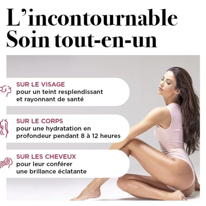 Un puissant cocktail d’ingrédients hydratants, dont l’Huile de Tsubaki, offre une hydratation intensive totale pour le visage, le corps et les cheveux. Cliniquement testée pour hydrater durant plus de 12 heures, cette formule multi-usage laisse la peau hydratée, lisse et éclatante, sans sensation de gras. Les cheveux retrouvent hydratation et brillance.