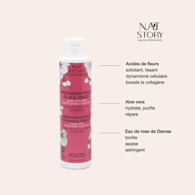 ALOE VERA, EAU FLORALE DE ROSE DE DAMAS, ACIDES DE FLEURS D’HIBISCUS.