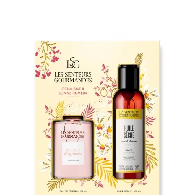 DOUCEUR D’AGRUMES : ALCOHOL, PARFUM (FRAGRANCE), AQUA (WATER), LIMONENE, CI 14700, CITRAL, CI 17200, COUMARIN, LINALOOL, CITRONELLOL, GERANIOL, EUGENOL. 89% d’ingrédients d’origine naturelle | HUILE SÈCHE PARFUMÉE : HELIANTHUS ANNUUS SEED OIL, C15-19 ALKANE, COCO-CAPRYLATE/CAPRATE, SIMMONDSIA CHINENSIS SEED OIL*, PARFUM, TOCOPHEROL, BISABOLOL*. *ingrédients issus de l’agriculture biologique. 100% du total des ingrédients sont d’origine naturelle. 53% du total des ingrédients sont issus de l’agriculture biologique. Cosmos Organic certifié par Cosmécert selon le référentiel COSMOS