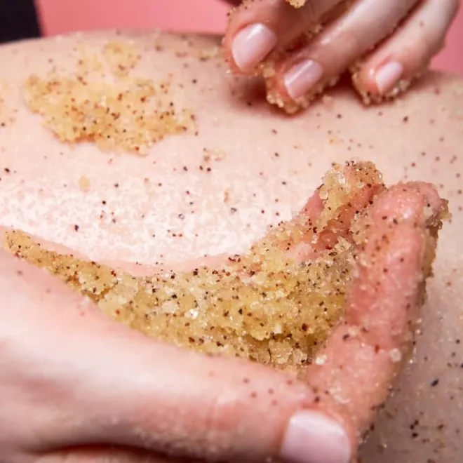 - Appliquez votre gommage 1 fois par semaine directement sur le corps préalablement humidifié et massez en mouvements circulaires.