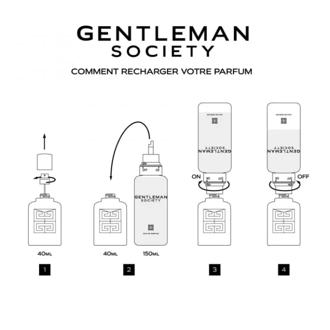 - Rechargez facilement votre flacon Gentleman Society Eau de Parfum 40 ml portant la mention « Rechargeable » avec la Recharge Gentleman Society Eau de Parfum 150 ml.
