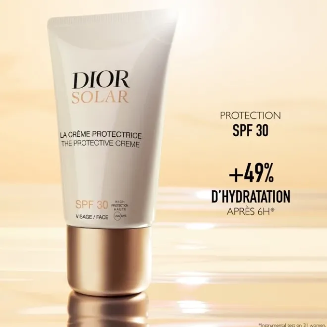 Bénéfice produit : Dior Solar La Crème Protectrice Visage SPF 30 protège la peau des UVA/UVB tout en la rendant visiblement plus belle : la peau est éclatante et hydratée, le bronzage est uniforme.