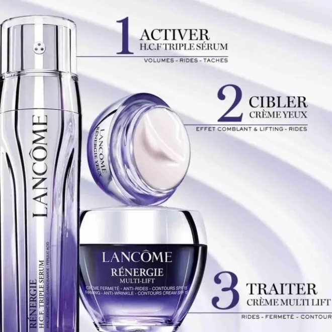 Avec Rénergie Multi-Lift, les laboratoires Lancôme ont développé une gamme de soins lifting redéfinition pour des résultats visibles et cliniquement prouvés :