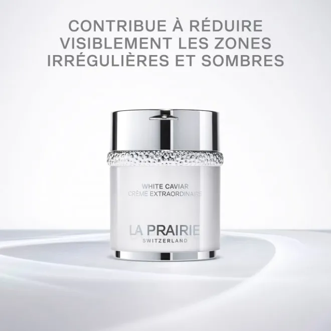 Dotée d’un effet illuminateur intense, la Crème Extraordinaire White Caviar La Prairie agit à la surface de la peau pour augmenter son pouvoir réfléchissant. C’est grâce à une molécule révolutionnaire, la Lumidose, que La prairie est parvenue à obtenir une action illuminatrice jusqu’alors jamais atteinte. Non seulement la Lumidose réveille l’éclat du teint, mais elle contribue à lutter contre les désordres pigmentaires à l’origine des taches brunes notamment. Ce soin révélateur d’éclat est enrichi d’un extrait de caviar doré reconnu pour ses vertus raffermissantes, ainsi que du Complexe Cellulaire exclusif qui revitalise la peau. Des agents exfoliants, lissants et hydratants viennent compléter la formule pour améliorer la texture et la qualité de la peau.